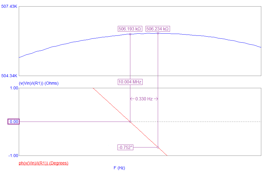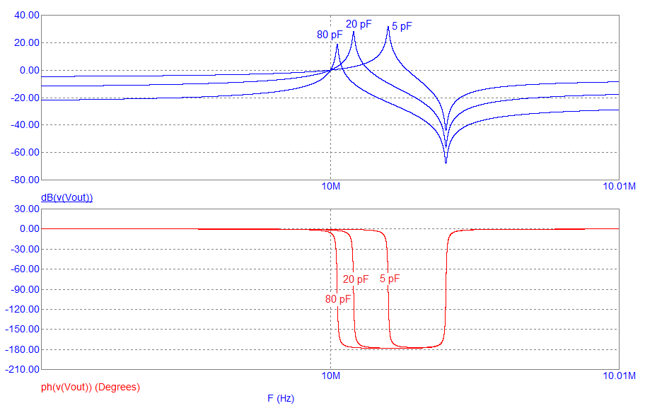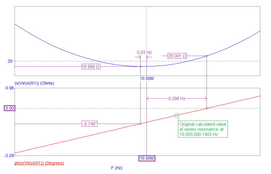 Using this formula: \(\dfrac{1}{2\pi\sqrt{Ls\cdot Cs}}\), the series resonance is 10,000,000.1403 Hz
