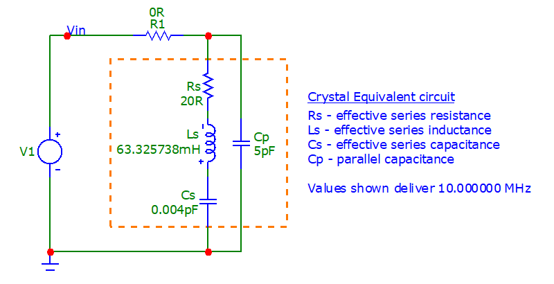 The equivalent circuit is supplied by the crystal manufacturer. It can be used in the following circuit to reveal the crystal's impedance. The values chosen are typical of a common crystal but, I've adjusted Ls to produce series resonance at very close to 10,000,000 Hz. I'm choosing 10 MHz because it's a nice round number and is typical of many crystals: -
