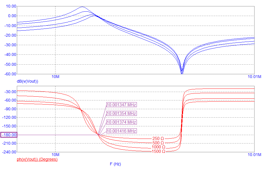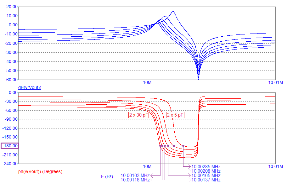 Previously we fixed the drive resistance at 500 Ω and looked at the effect of varying the loading capacitors. This time we'll keep the loading capacitance at 20 pF and vary the drive resistor (R1) from 250 Ω to 1500 Ω: -