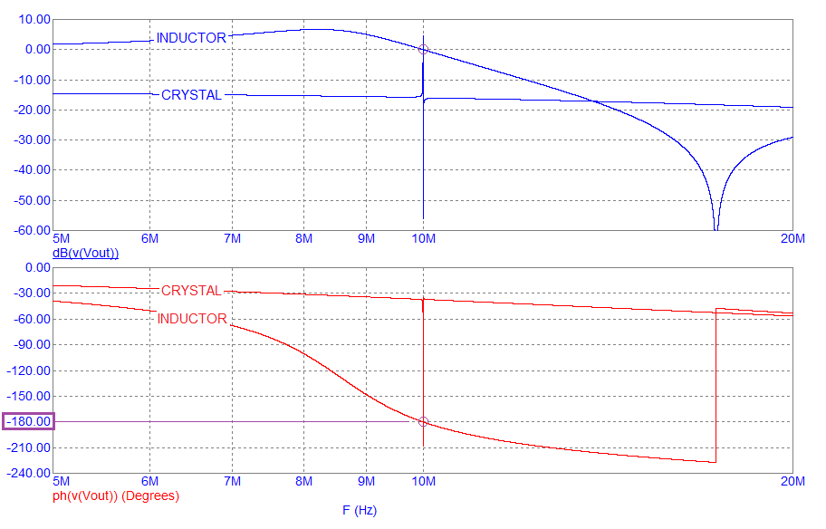 RECAP The crystal by itself may be series resonant at precisely 10 MHz but, for an oscillator circuit, we are interested in the 180° point in the transfer function. In a Pierce Oscillator circuit (using an inverting gate as an amplifier), the crystal circuit "provides" the extra 180° to produce an overall phase shift of 0°. Only this condition creates oscillation and fulfils part of the Barkhausen Stability Criterion. |