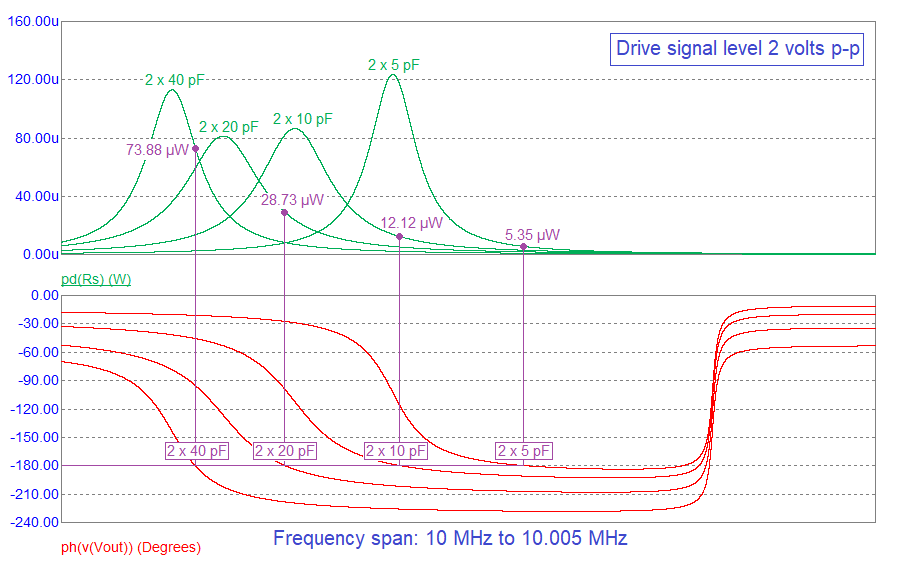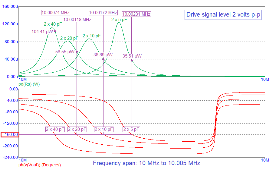 Many crystal manufacturers specify the maximum allowable power that can be used with their devices. This maximum power, along with the stated loading capacitance, are inter-related. Consider the current that flows in the series element Rs at the oscillation frequency. We can simulate this and plot power dissipation in Rs (pd(Rs)): - The power figures above are at their respective oscillation frequencies (as dictated by a phase angle of 180°). The power figures are at a drive level voltage (Vin) of 2 volts peak-to-peak feeding via 500 Ω (R1). This is the default value for the simulation AC analysis. The upshot is; if you increase load capacitance, the crystal's power dissipation becomes higher. More heat means a greater likelihood that the crystal accuracy is undermined. A higher drive level means more heat. |